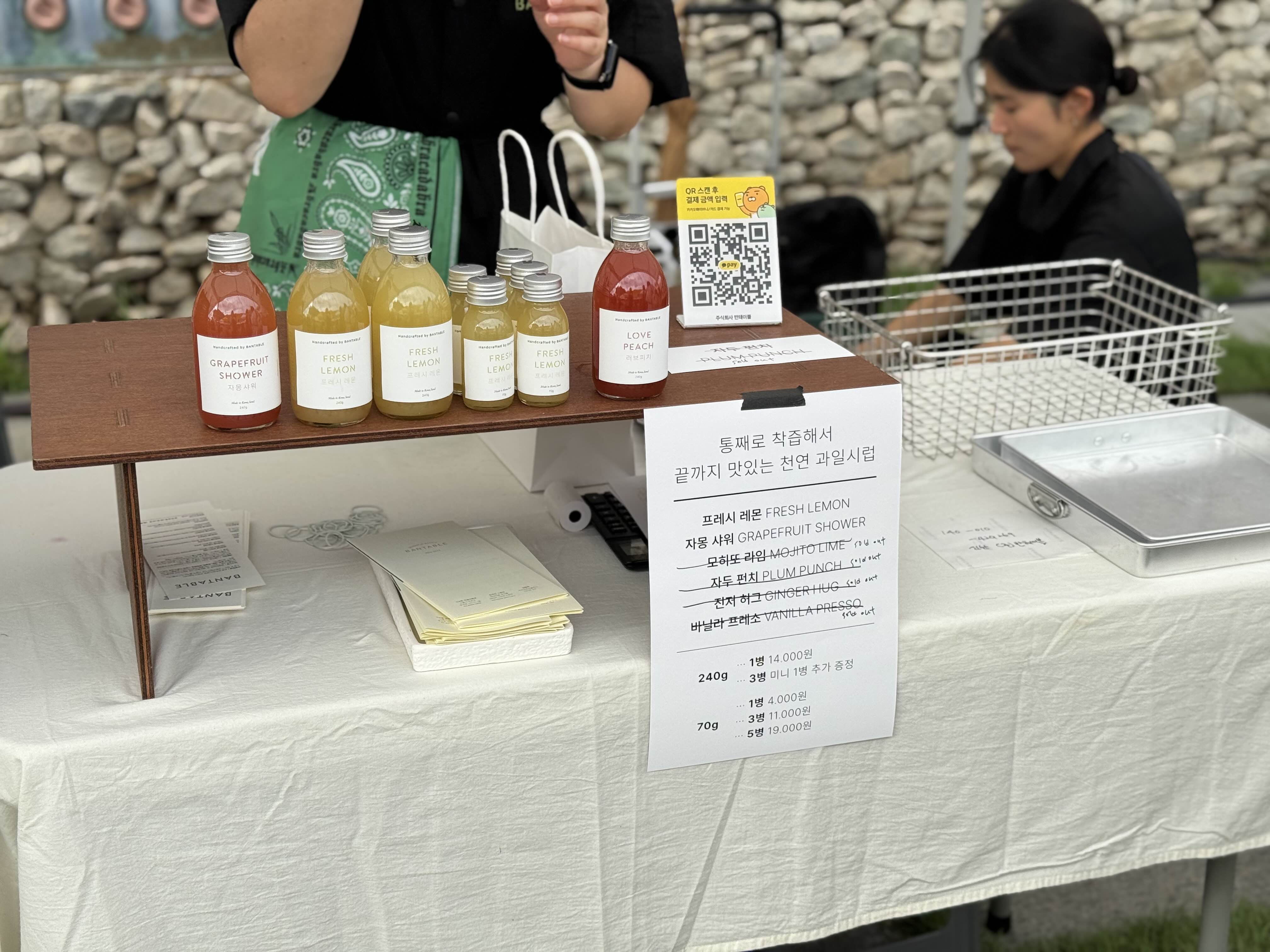 옆으로는 통으로 착즙한 과일 시럽을 판매하고 있어요.