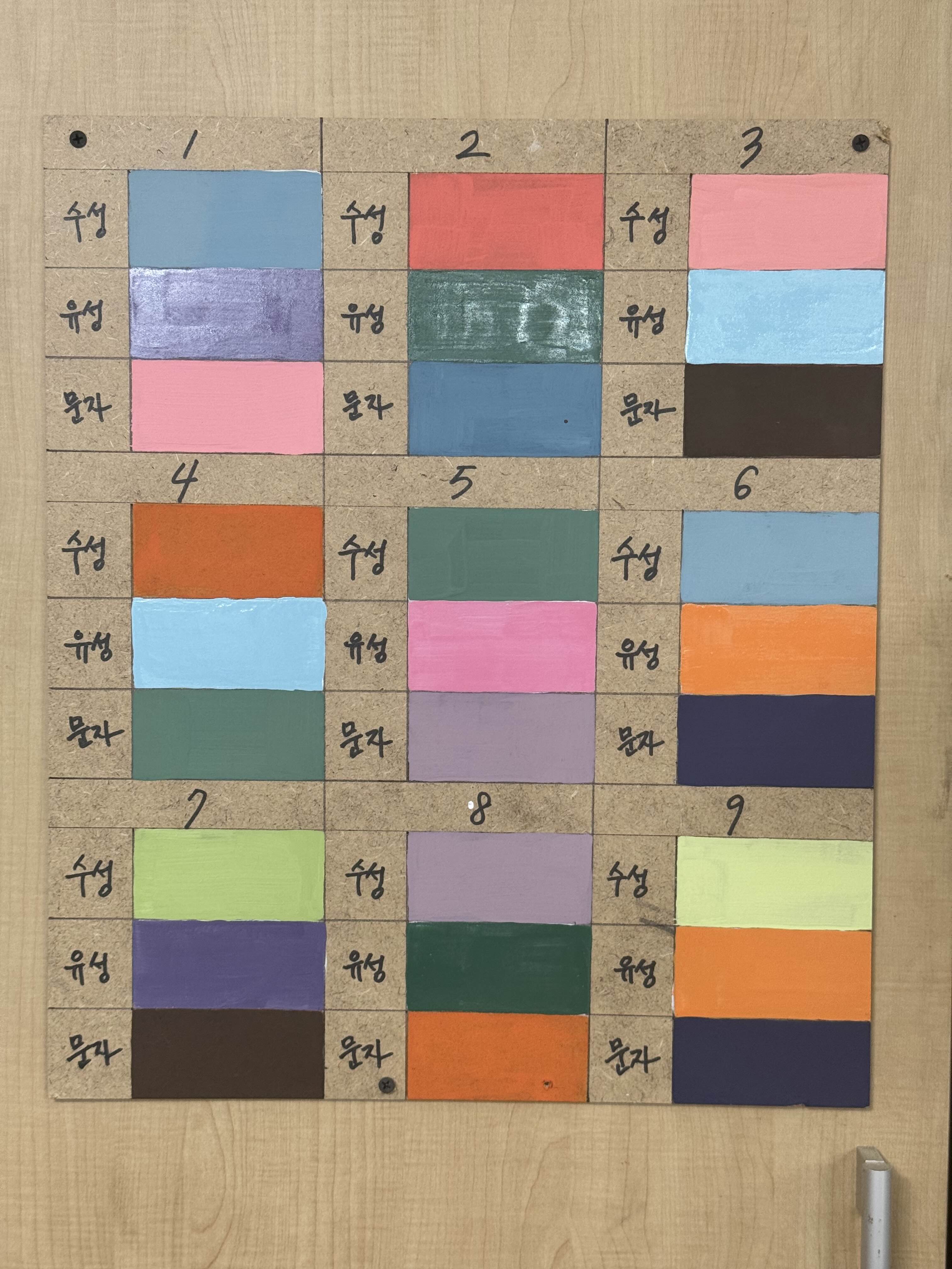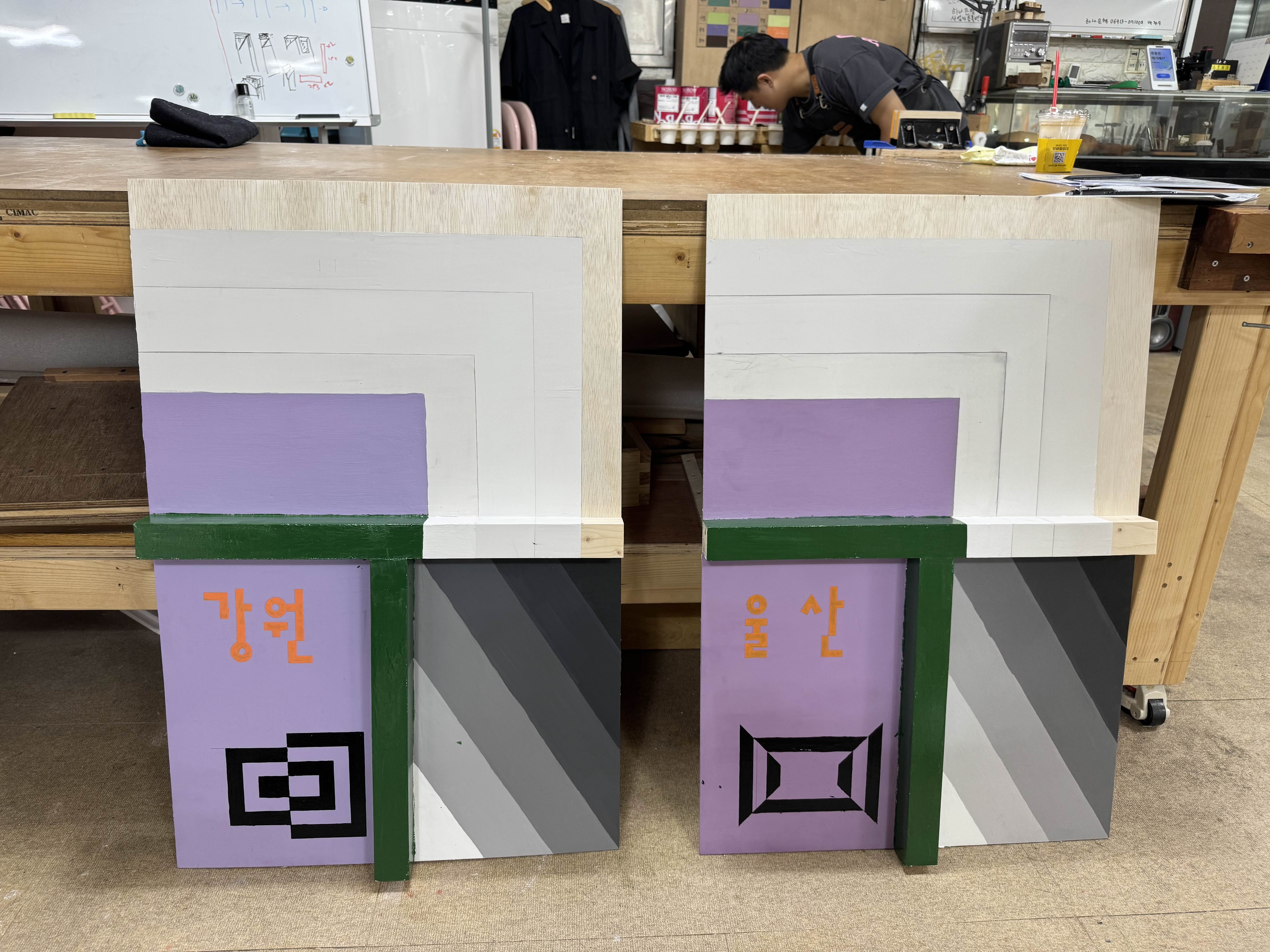 작업 순서는 합판 전체 연마 -> 선긋기 -> 퍼티 작업 -> 연마 -> 수성 / 유성 -> 연마 -> 수성 / 유성 -> 그라데이션 -> 문자 / 도형 순인데 본인이 편하게 할 수 있는 순서를 찾는 게 좋더라고요.